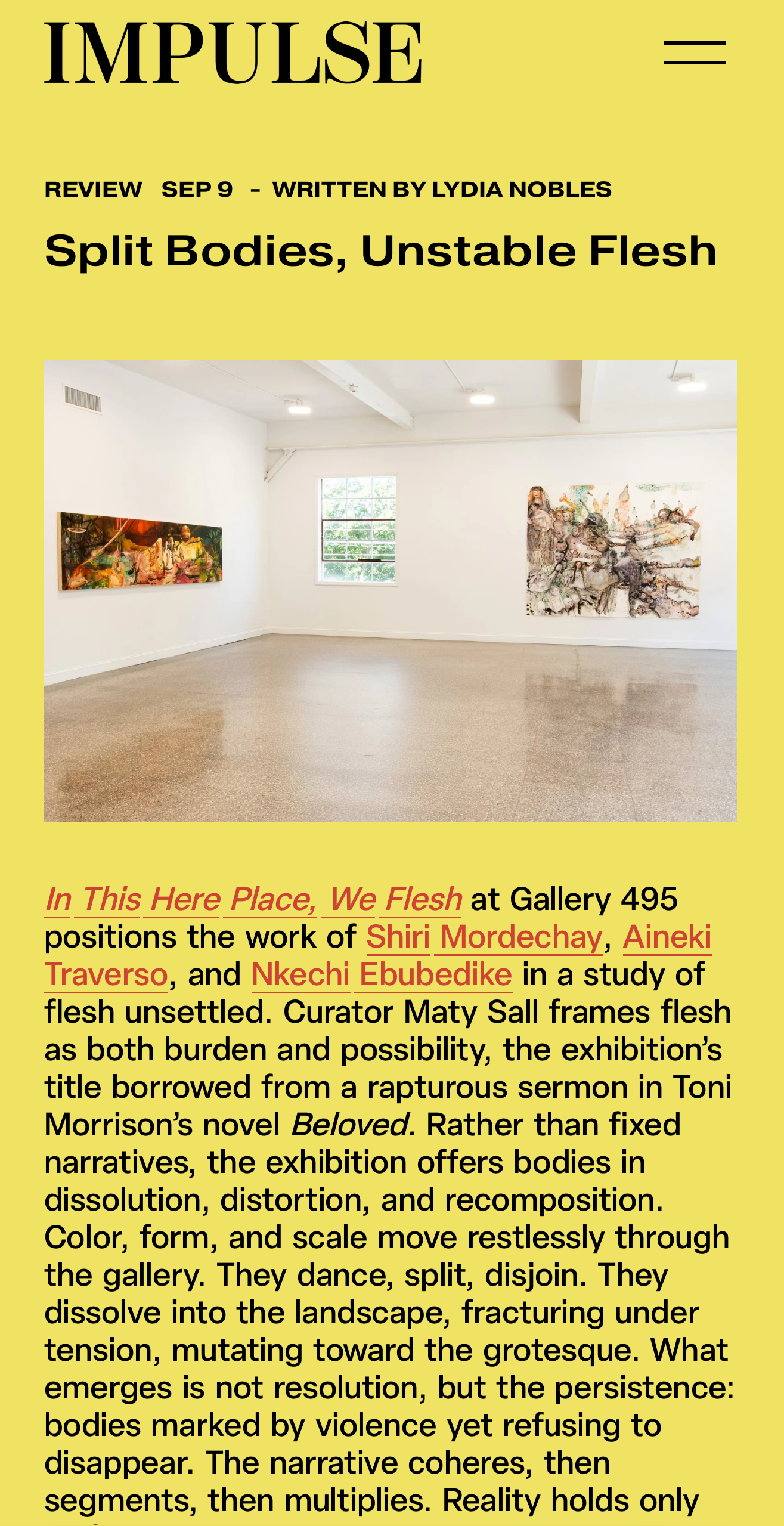 In This Here Place, We Flesh brings together three artists—Aineki Traverso, Nkechi Ebubedike, and Shiri Mordechay—who explore the human form as a mutable terrain where memory, myth, and identity converge. Echoing Baby Suggs’s words in Toni Morrison's Beloved, this exhibition centers the body as a site of transformation and reclamation, shaped by ancestral knowledge, psychic weight, and the ongoing pursuit for autonomy and spiritual wholeness.